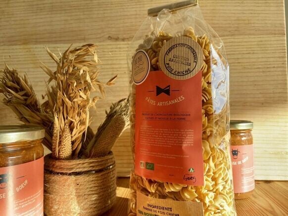 Plaisir Gourmand : « Nos pâtes artisanales sont fabriquées à la ferme, non chauffées durant la fabrication grâce à des matrices en bronze puis séchées à basse température afin de garantir un goût et une qualité incomparable. » Geste santé : Ces pâtes aux pois chiche allies équilibre nutritionnel et plaisir, elles sont riches en protéines, fibres et fer. De plus elles ne contiennent pas de gluten. Cuisson 3 à 5 minutes